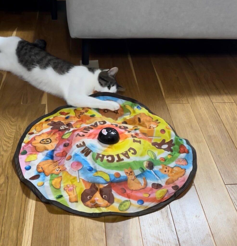 ロンちゃんはひとり遊びが得意!留守番中も退屈しないよう、自動で動くおもちゃを置いています。
