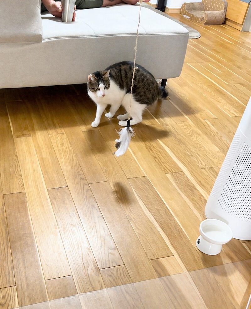 ロンがお腹を見せてごろんとしているとき、決まって一緒に遊ぶのが釣り竿タイプのおもちゃです。