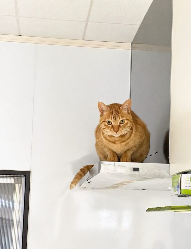 私が台所に立つと、リーが必ず冷蔵庫の上に乗ってきて、その後フードの上に飛び乗ります。
