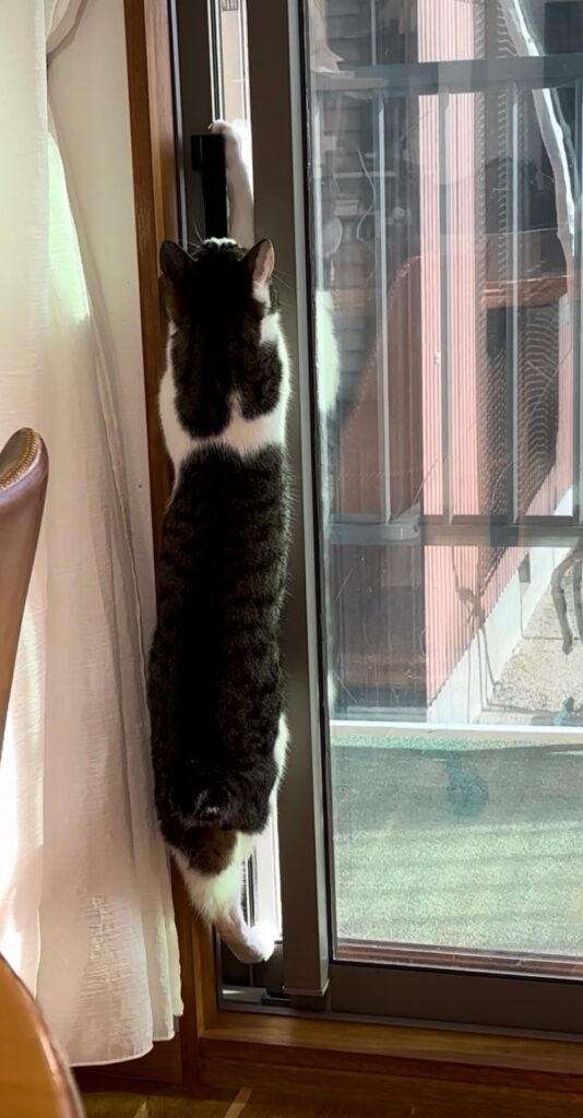 猫は敏感に反応します。窓の外をじっと見つめて尻尾をパタパタさせるしぐさは、