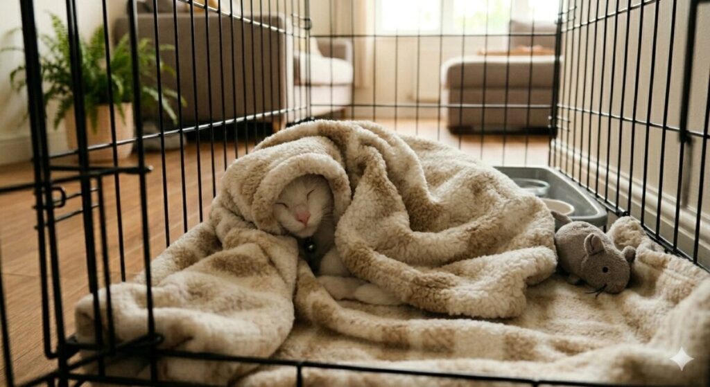 ゲージの毛布にくるまって、2日間ごはんを食べなかった